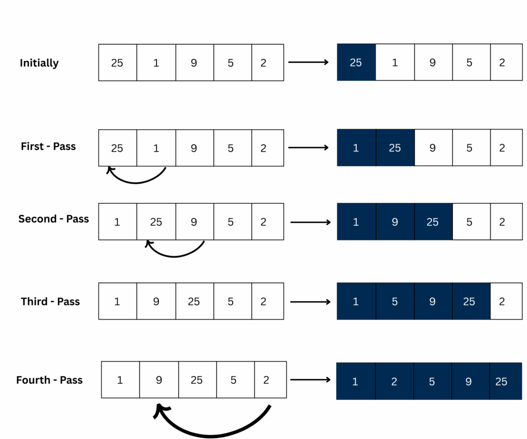 Now, the first four elements (1, 5, 9, 25) are sorted.