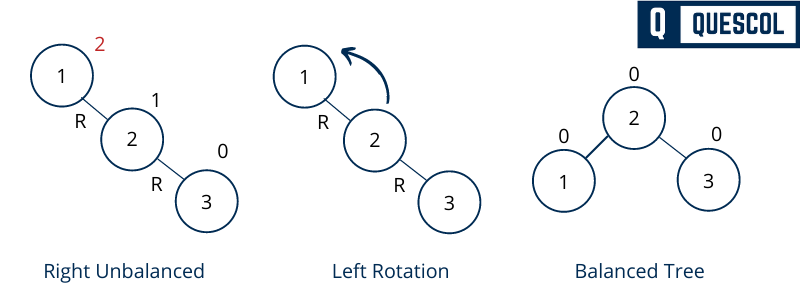 In the above example, node 1 has become unbalanced because its balanced factor becomes 2. Here We perform the left rotation by making 2 the root and 1 as left node of 2.