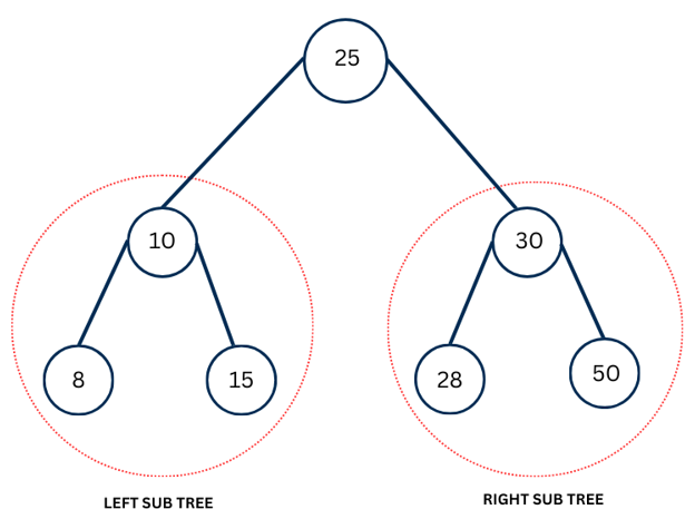 In the above figure, the tree is a Binary Search Tree (BST) because it follows the rule that all left children are smaller than their parent and all right children are larger. The root node is 25. Its left child is 10, which has children 8 and 15, both smaller than 25. The right child of the root is 30, which has children 28 and 50, both larger than 25.