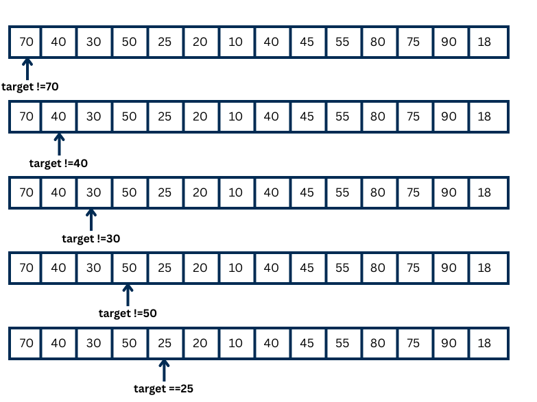 In the above figure, the target value is 25. First, we look at the first element, 70. It is not 25, so we move to the next element, 40. It is also not 25. Then we check 30 and 50, but they are not 25 either. Finally, we compare with the next element, and this time it is 25. So, we target value we were looking for in the list.