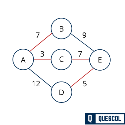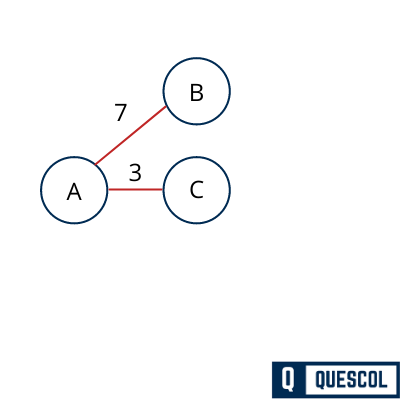 After choosing the A as root node, we see that (A,B), (A,C) and (A,D) are three edges with weight 7, 3, and 12, respectively. We choose the edge (A,C) as it has the minimum edge weight.