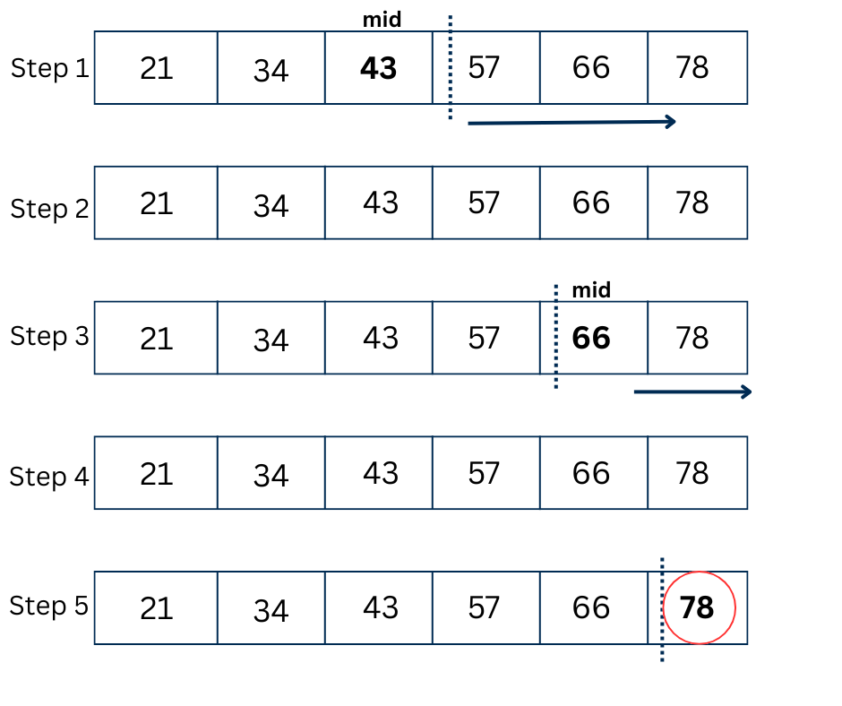 Step 1: We calculate the middle index, which is at 43. Since 78 is bigger than 43, the element must be on the right side.