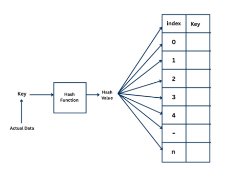The figure shows how a hashing works. The actual data, called the key, is given as input to a hash function. The hash function produces a hash value or the index, which tells where to store the corresponding value or key in the table.