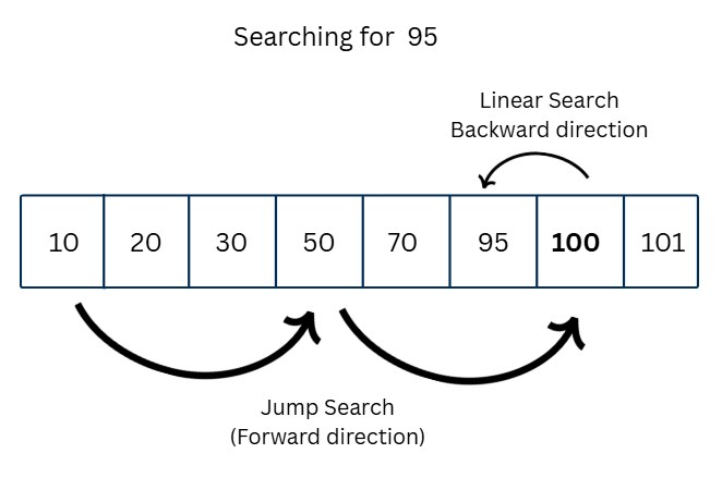 In the above figure, we first jump from 10 to 50. Since 50 is still less than the target 95, we jump again. This time, we reach 100, which is more than 95. So, we do a linear search in backward direction in the previous block (50 to 100). We check 95, which is the next element from 100, and also the target element.