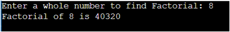 The input number from the user to find the factorial is 8. The calculated value of the factorial is 1*2*3*4*5*6*7*8.